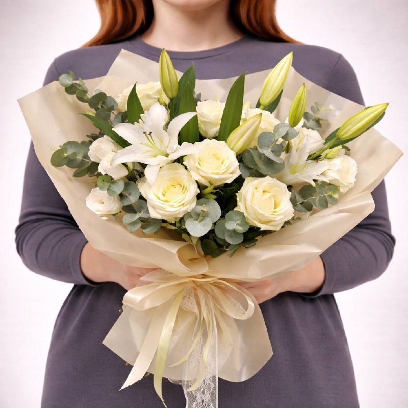 | Состав: | Лилии, Розы, Эвкалипт, Эустомы |