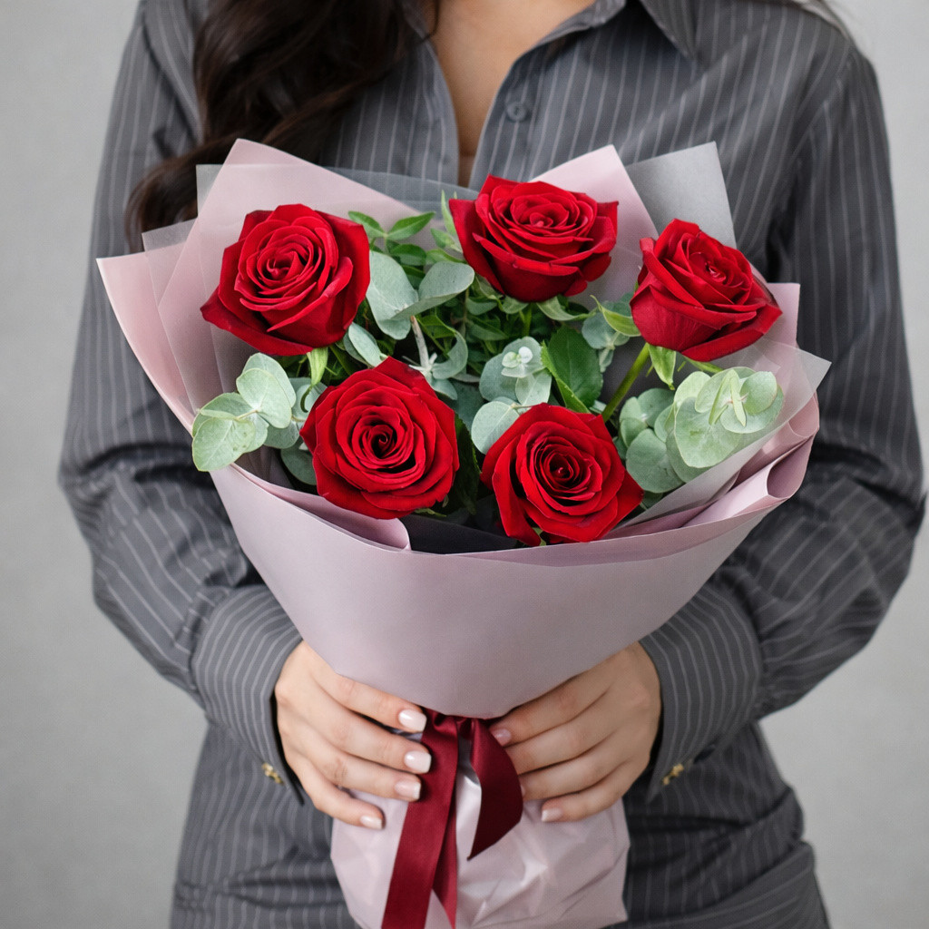 Изысканный букет из пяти алых роз — это символ искренних чувств, страсти и элегантной классики. Бархатные лепестки насыщенного красного цвета в сочетании со свежей декоративной зеленью создают выразительный и гармоничный образ. Букет оформлен в стильную упаковку с атласной лентой и станет идеальным подарком для признания в любви, романтического свидания или тёплого знака внимания близкому человеку.