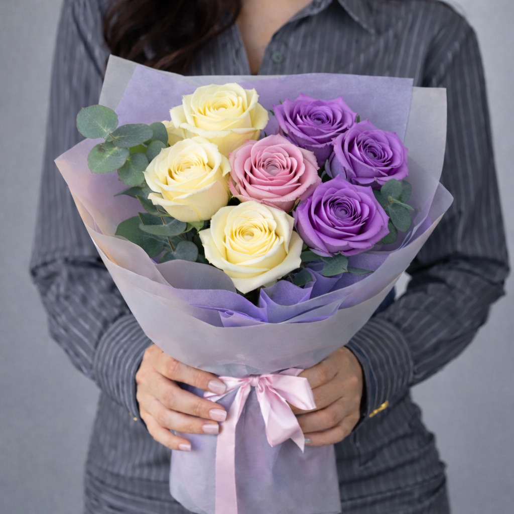 Изысканный букет из семи нежных роз — это гармоничное сочетание утончённости и мягкой романтики. Светлые кремовые и сиреневые оттенки цветов создают атмосферу спокойствия, тепла и искренних чувств, наполняя пространство светлым настроением. Воздушная упаковка и изящная атласная лента подчёркивают лёгкость композиции, делая букет идеальным подарком для признания, благодарности или трогательного знака внимания без лишних слов.