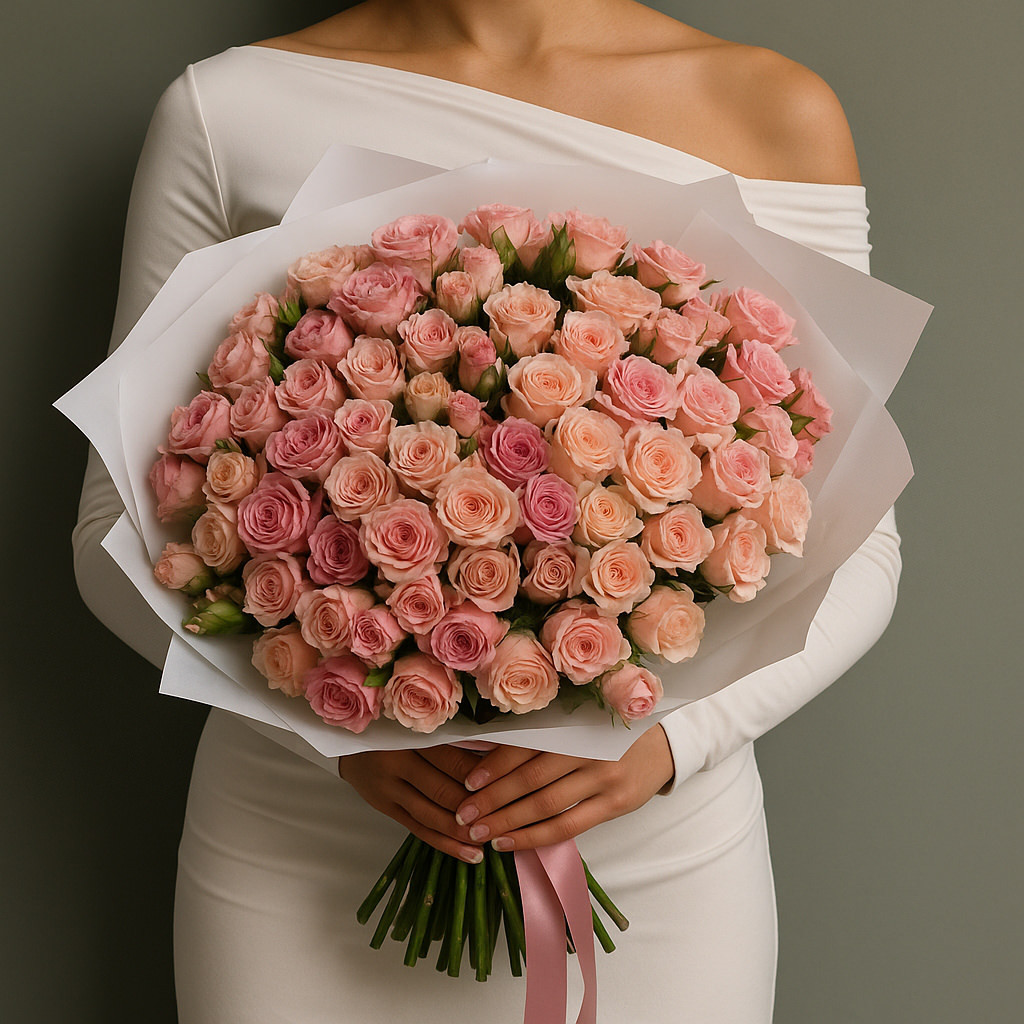 Роскошный букет кустовых роз в пастельно-розовой гамме — идеальный подарок, который покоряет с первого взгляда. Гармоничное сочетание нежных оттенков и воздушной упаковки делает композицию универсальной для любого торжества. Такой букет подчеркнёт ваши чувства и станет незабываемым украшением момента.