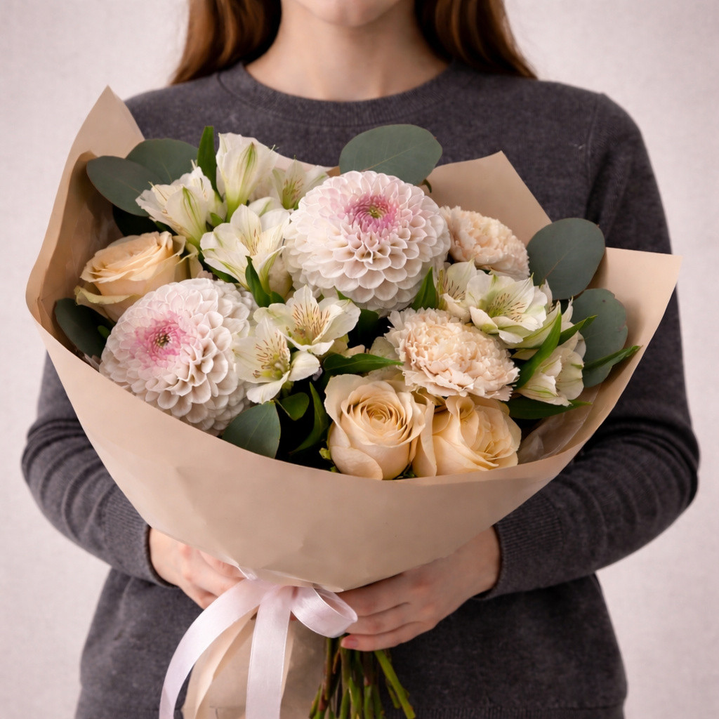 | Состав: | Альстромерии, Гвоздики, Георгины, Розы |