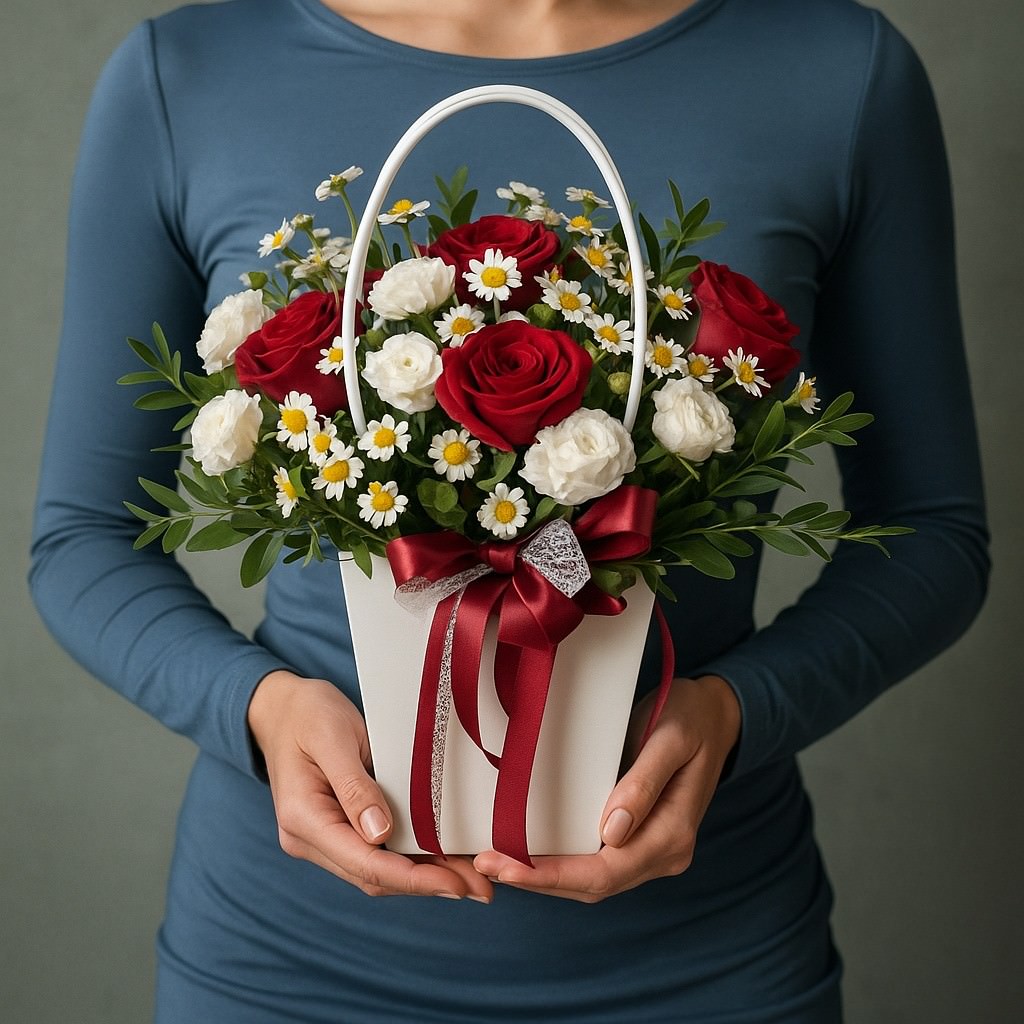 Яркая композиция с красными розами и ромашковыми хризантемами — символ нежности и радости. Такой подарок зарядит позитивом и энергией.