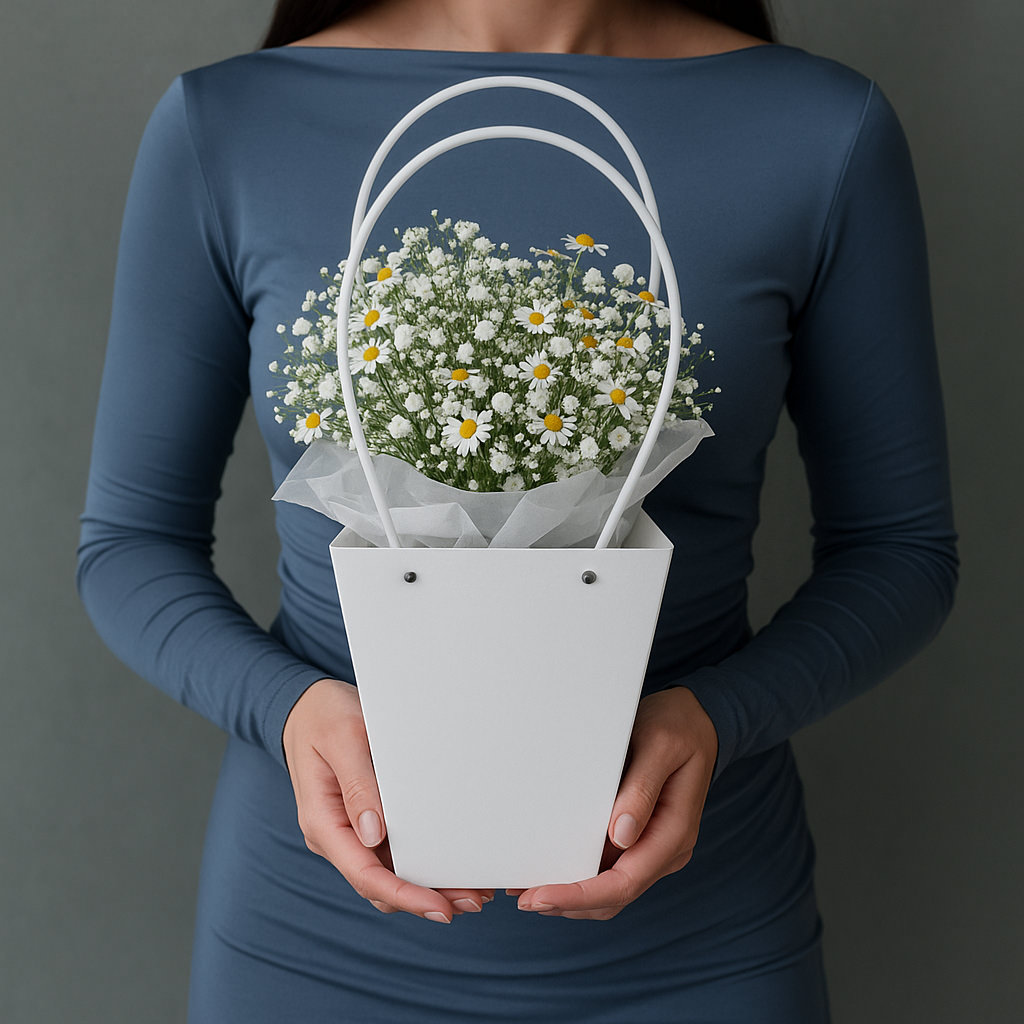Очаровательный букет из ромашек и гипсофилы в белой коробочке станет универсальным подарком для любого повода. Символ чистоты и радости.