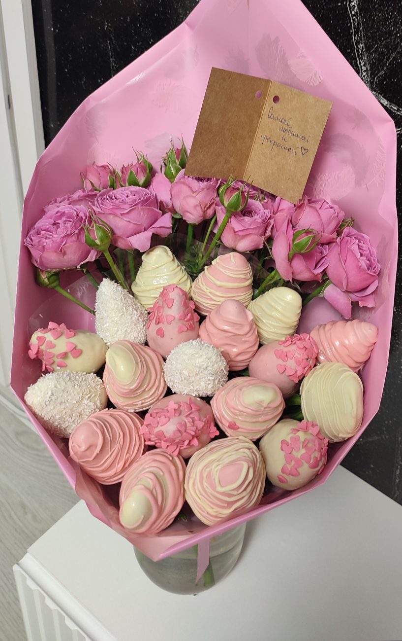 Очень качественный букет,жена в восторге. Шоколад настоящий, суперская клубника. Заказывал к 8 марта, отличная служба доставки. Однозначно рекомендую!